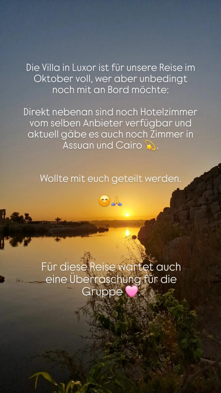 Diese Art zu reisen ermögliche ich auch Dir, im 1zu1, mit deinem Partner, deiner Familie oder im Rahmen einer klein-Gruppenreise. Ich führe Dich als Hohepriesterin durch die Tempel, den Nil rauf und in die Wüste. Das Ganze in einem sehr intimen, familiären Rahmen.